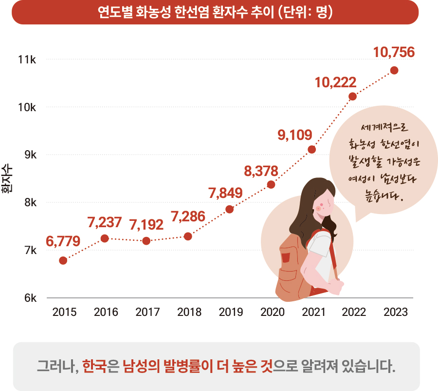 화농성 한선염(Hidradenitis Suppurativa)은 전체 인구의 약 1%에게 발병할 수 있는 만성 염증성 피부질환으로 고름땀샘염 이라고도 불리며 피부염증과 통증, 고름 배출 등으로 환자에게 큰 신체적·정신적 부담을 주는 질환이다. 아직 화농성 한선염에 대한 사람들의 인식이 낮은 편이라 많은 환자들이 오랜 기간 진단받지 못한 채 적절한 치료 시기를 놓치고 있는 경우가 많다. 화농성 ‘한선’염은 병명에 포함된 것처럼 아포크린땀샘(한선)이 주로 분포하는 겨드랑이, 사타구니, 항문·생식기의 피부영역에서 대개 양측성으로 발생한다. 특히 초기에는 피부가 접히는 부위에 통증을 동반하는 염증성 피부결절이나 농양이 발생하는 것이 특징이며, 진행되는 경우 닫히지 않는 구멍들이 발생해서 계속 고름이 분비되는 피부누공이 형성되기도 한다. 보통 가족력, 면역 문제, 피부 자극, 비만, 흡연, 호르몬 변화 등이 영향을 주는 것으로 알려져 있다.