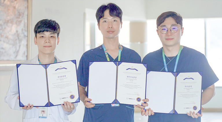 영상의학과 김도훈, 권태근, 박병준 방사선사가 최근 대한방사선사협회 경남도회가 주최한 제13회 대한방사선사협회 경상남도회 종합학술대회에서 최우수논문상과 우수논문상을 각각 수상했다.